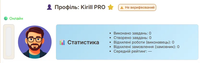 - Контекст: Якщо ви Виконавець — використовуйте професійне фото. Якщо ви Комітент (бізнес) — завантажуйте чітке лого.